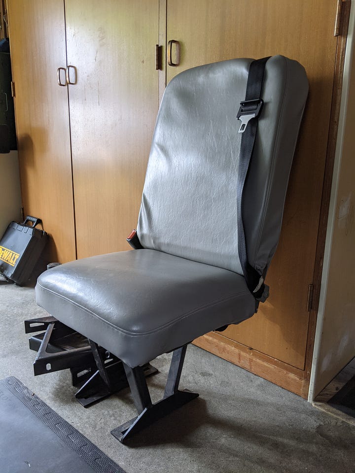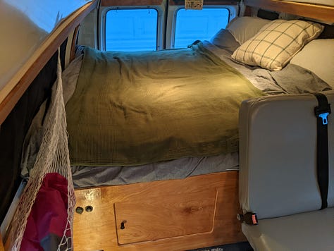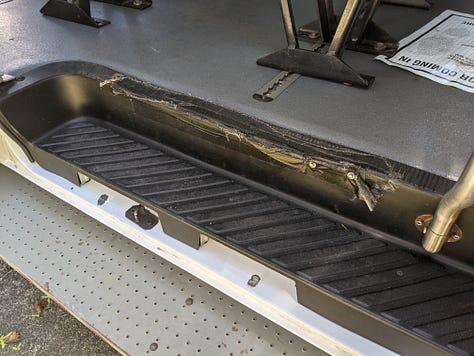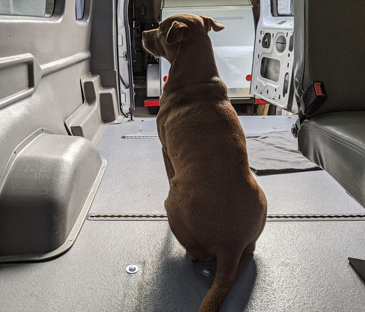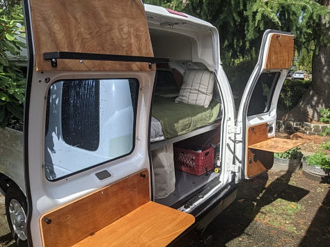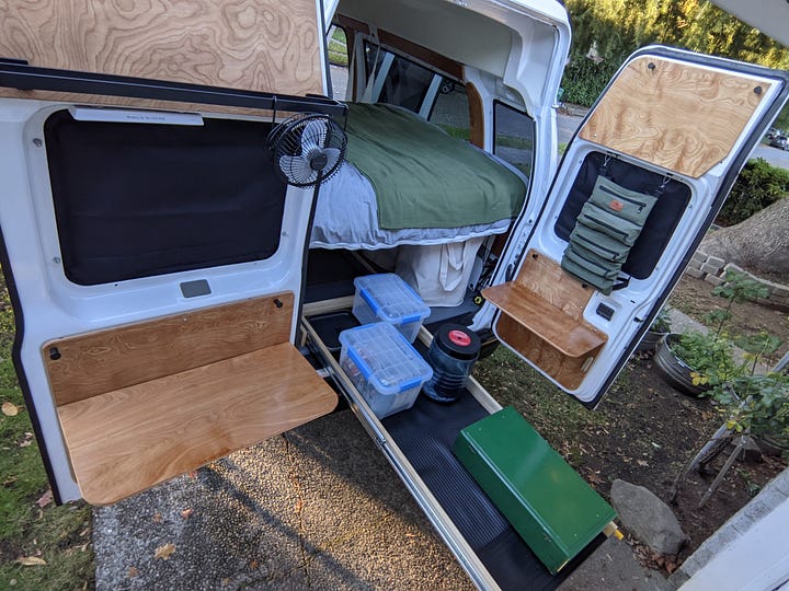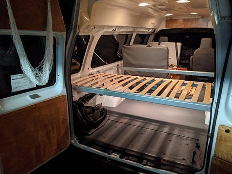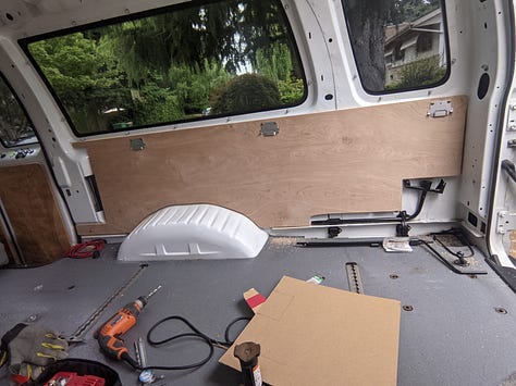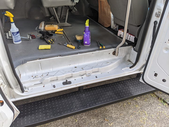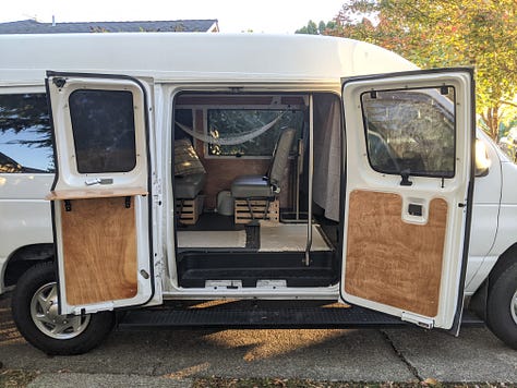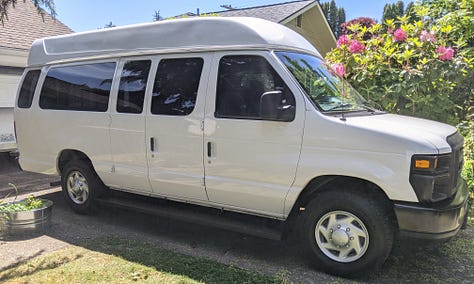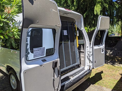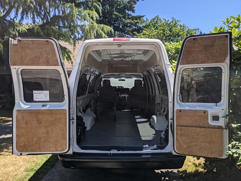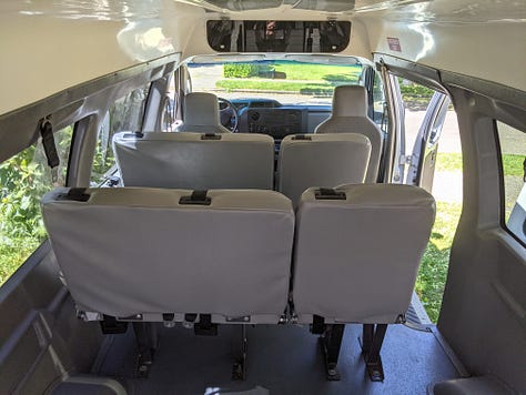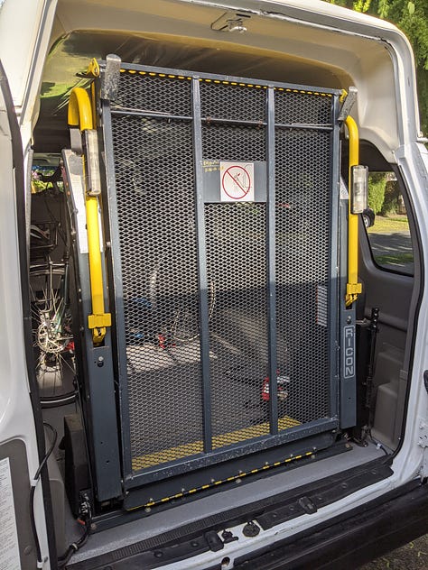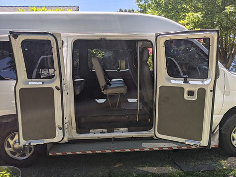 The purchase: a 2009 Ford e250 accessibility van with wheelchair lift, bench seats and a raised roof. First step was to remove and donate the lift.