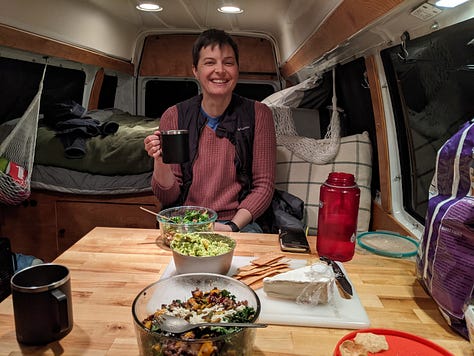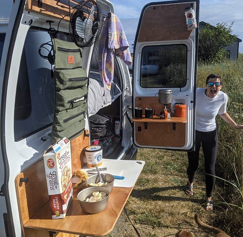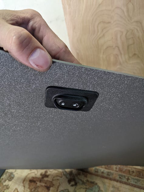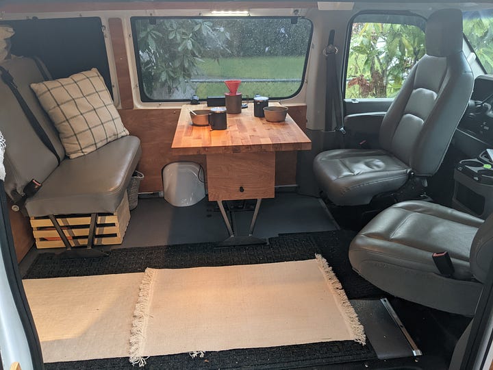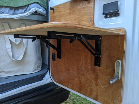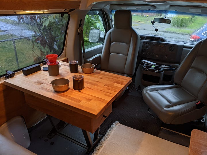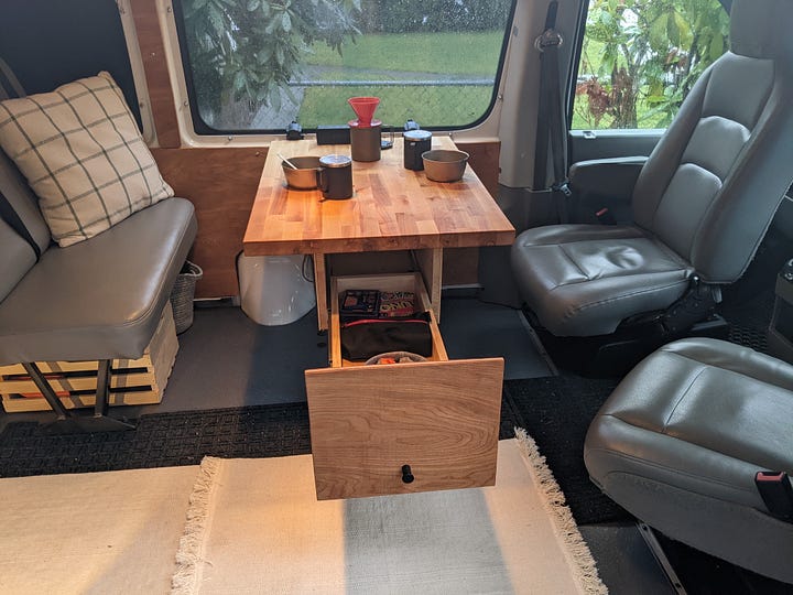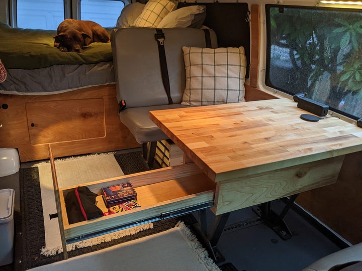 A tabletop with storage drawer was mounted to existing bench seat legs, plus swivel mounts were added to the front bucket seats to face backward. Large drawer pulls were used for a large storage drawer out the back doors.