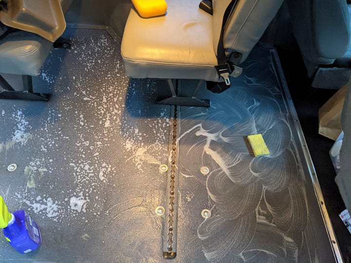 Next step was to clean surfaces, replace the door step, remove the wheelchair lift and remove unnecessary bench seats.