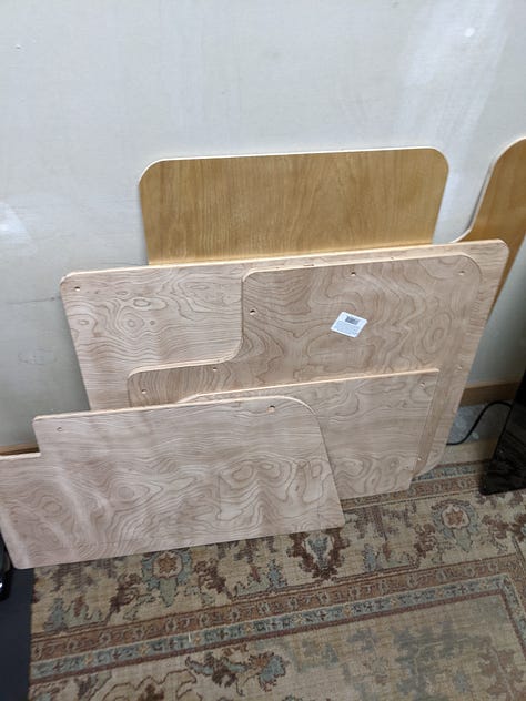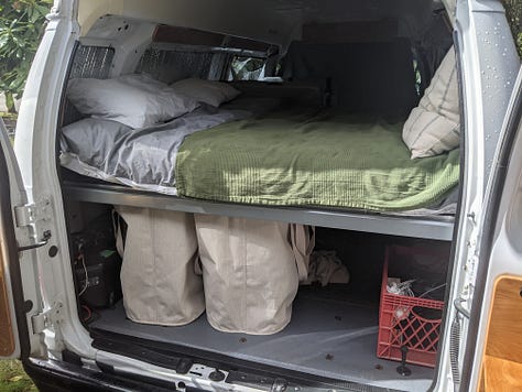 Using Ikea bed frame beams, brackets, and slats, an almost queen-sized bed with 6" memory foam mattress cut to size was added.